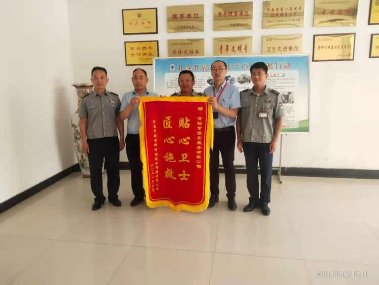 6月2日下午,保安二部服務(wù)單位瑞創(chuàng)公司韓海波主任一行人來我公司,向公司贈(zèng)送“貼心衛(wèi)士,匠心施救”錦旗,對(duì)二部翟玉林中隊(duì)保安員王寶慶危急時(shí)刻救治瑞創(chuàng)職工事,表示高度贊揚(yáng)和誠(chéng)摯感謝。